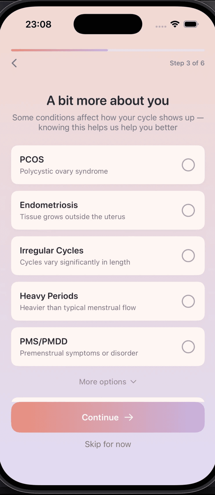 A simple onboarding quiz helps Syncla adapt to your body, cycle, and experiences.